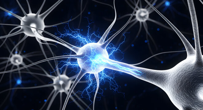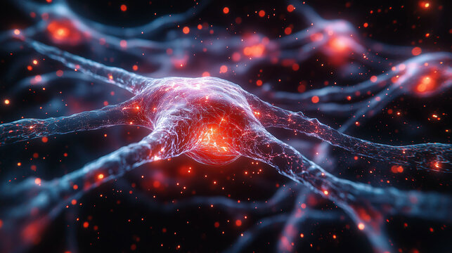 Close-up rendering of a glowing neuron with branching axons and dendrites, showing synaptic connections and electrical activity in vivid red and blue tones.