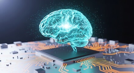 glowing digital brain hovers over circuit board, symbolizing AI integration technology. image highlights fusion of artificial intelligence with electronic systems, showcasing innovation and
