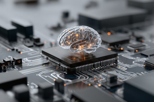 Glowing brain hologram hovers over microchip on circuit board, symbolizing advanced neuromorphic computing technology. image conveys innovation and futuristic concepts