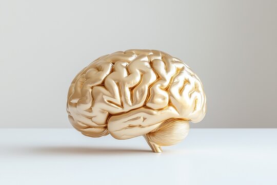 A golden brain model with intricate details, glowing softly, placed on a clean surface