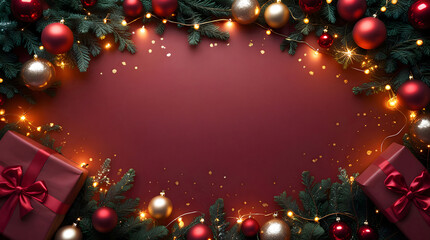 Christmas background with red and gold ornaments, fir branches and glowing fairy lights