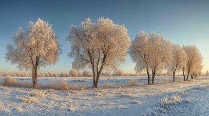A dazzling winter landscape with trees covered in sparkling frost, their frozen branches glowing under the quiet light of a crisp winter sky.
