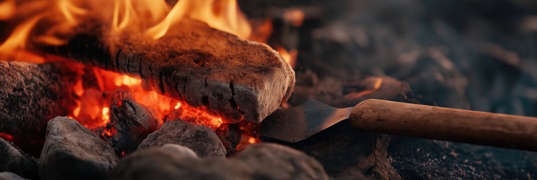 This image captures the essence of cooking over an open flame, featuring burning wood, glowing embers, and a metal spatula poised for grilling your favorite food.