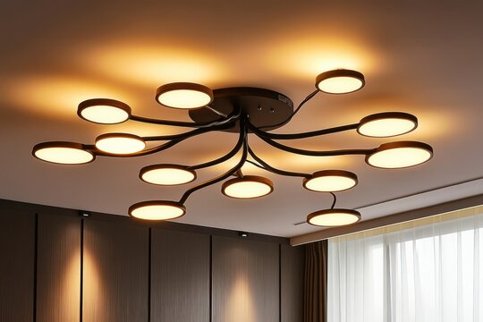 Rose-gold metallic light grid hanging from concrete ceiling with led diffusers