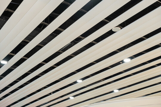 Modern slatted ceiling with integrated LED downlights and clean architectural lines, creating a minimalist and futuristic interior design for commercial or public spaces.
