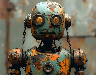 Close-up view of a retro, rusty robot with glowing eyes