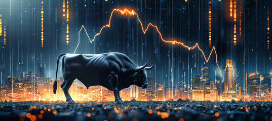 A powerful black bull stands confidently in front of a glowing cityscape, illuminated by a rising stock market chart that stretches across the night sky