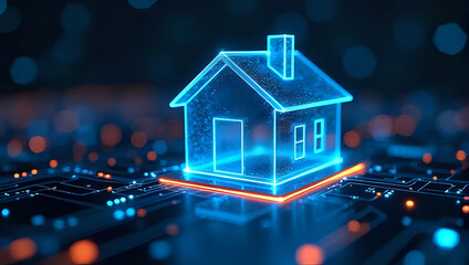 A glowing blue digital house icon on computer circuit board, futuristic abstract bokeh background - smart home technology, the internet of things, and real estate innovation concept