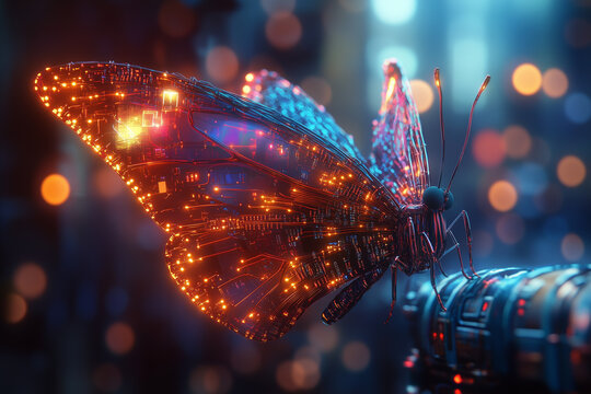 A 3D render of a butterfly with data-driven, holographic wings made of glowing digital lines and circuits, representing the fusion of technology and nature in a cyberpunk world