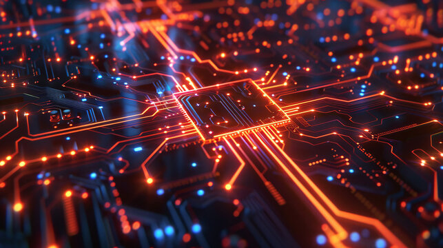 Close-up of a glowing microchip on a circuit board, highlighting the intricate design and orange lights.