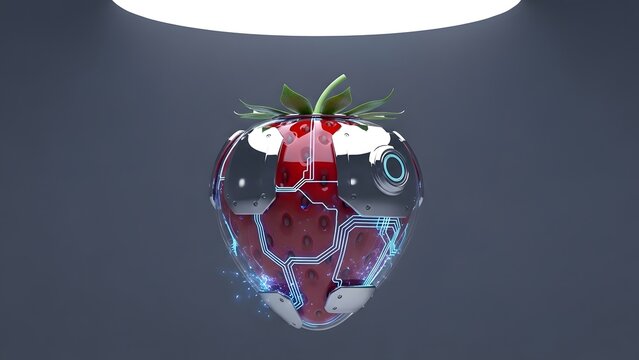Abstract 3d rendering of a translucent strawberry with internal red liquid and blue glowing circuits against a dark background illuminated by a soft light