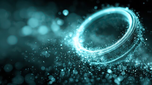 Abstract Cyan Glowing Ring with Glittering Particles on a Black Background Generates a Dynamic and Futuristic Technological Ambiance
