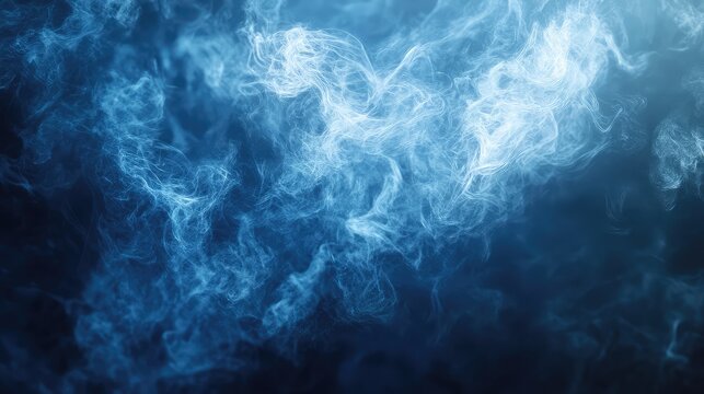 Blue luminous particles creating an abstract, swirling, smoke like cloud effect against a dark gradient background, representing concepts of energy, science, technology, and spirituality