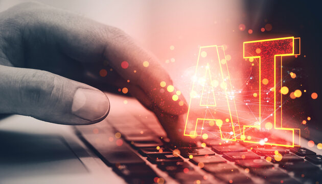 Hand typing on laptop keyboard with glowing AI text and digital elements, concept of artificial intelligence technology.