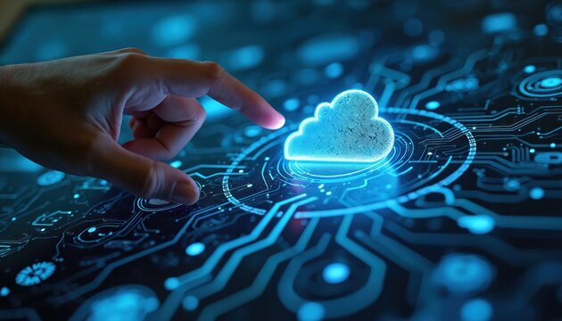 Human finger touches glowing cloud symbol on digital circuit board background. Illustrates cloud computing, digital transformation, data storage, cyber security, network infrastructure, future tech