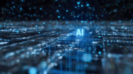 Illuminated ai chip on a circuit board with glowing blue lines and connections representing technology
