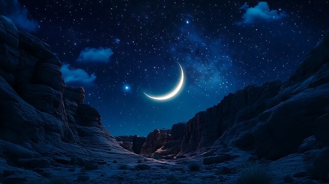 A thin crescent moon glowing softly in a star-filled sky above a rocky canyon.