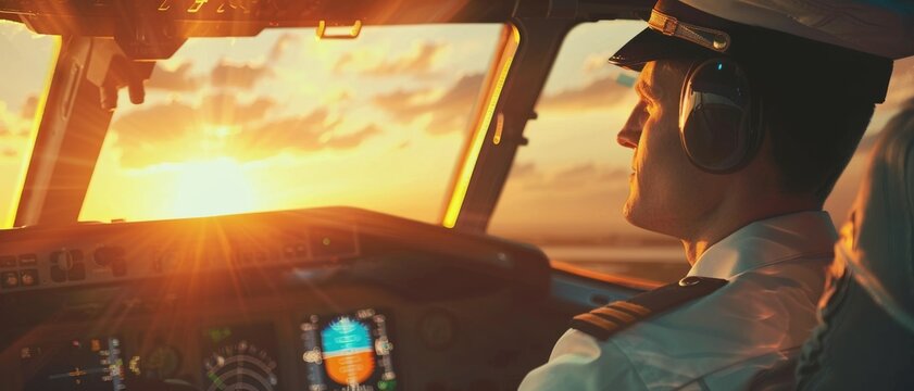 Faceless pilot navigating airplane controls with focus on the equipment and glowing sunset outside the cockpit window