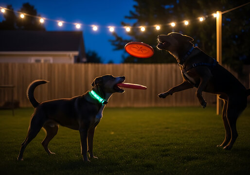 Dogs playing fetch at night with glowing collars under festive string lights backyard fun