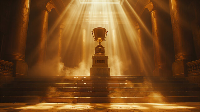 A glowing trophy stands on a grand staircase, bathed in golden light amidst foggy, ancient columns.