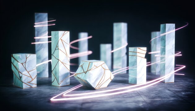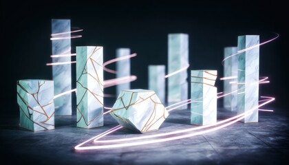 Abstract marble columns with glowing lines on a dark background