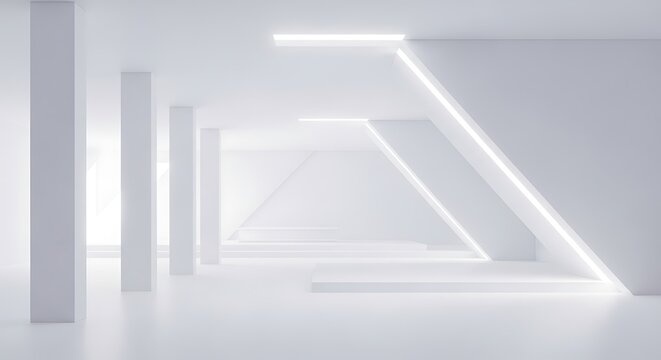 Modern minimalist white space featuring glowing lines and architectural columns, creating a futuristic ambiance