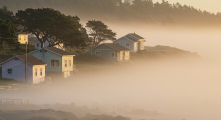 Snowy alpine cliffside hamlet with timber cottages and church spire at sunrise