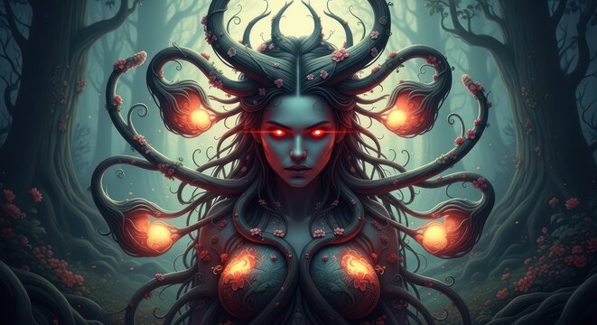 A blue and orange glowing creature with a skull-like face and jagged teeth is surrounded by branches that appear to grow out of its head.
