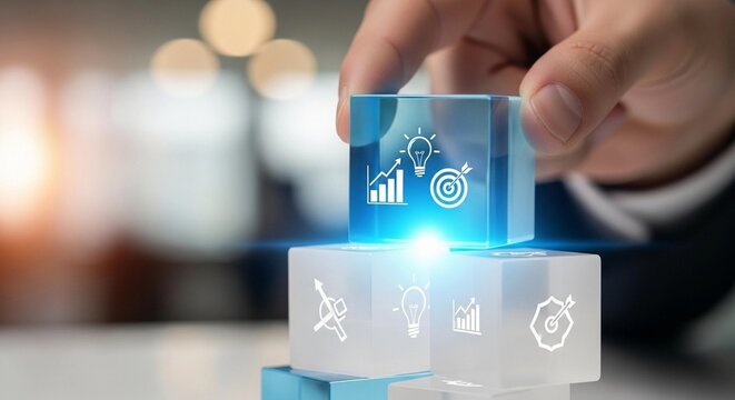Abstract digital design featuring glowing blue cubes on a dark background representing technology and innovation trends