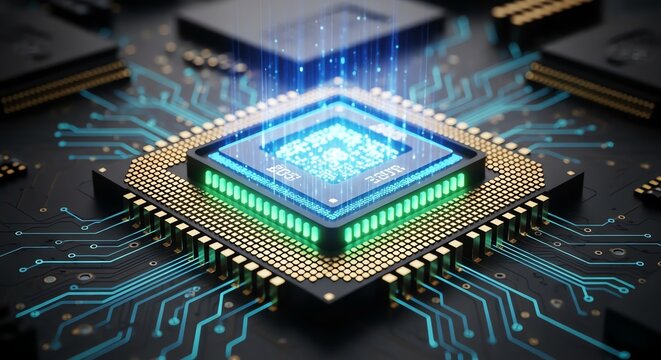 Dynamic AI processor chip with glowing data streams for cutting edge technology concepts