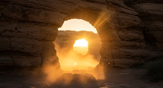 A vibrant pink archway shines brightly amidst the sandy desert, flanked by rocky dunes and a star-filled sky, evoking a dreamlike, futuristic vibe