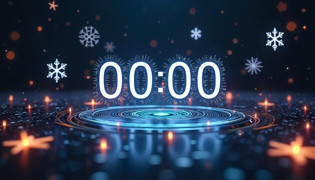 New Year's Eve time indicator with snowflakes and festive lights on a dark background.