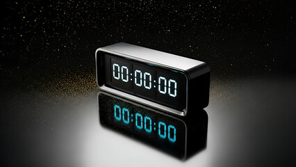 Modern digital timer displaying zeros on a reflective surface with a dark, starry background.
