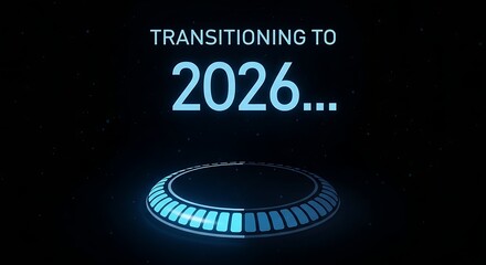 A digital countdown with a loading circle indicates the transition to the year 2026, set against a dark, futuristic backdrop