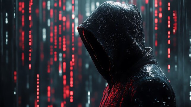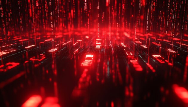 Glowing red and black code streams across a dark digital background, evoking a hacker's workspace.