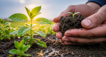 Close up elderly hands sharing glowing sprouting seed after rain droplets on leaves symbol growth regeneration climate care future earth tenderness