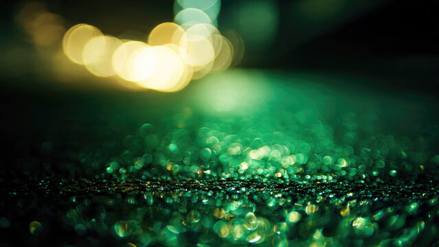 A mesmerizing abstract image featuring vibrant green glitter in the foreground and golden bokeh lights shimmering in the blurred background.
