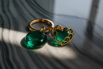 Emerald heart and orb charms on gold keychain elegant jewelry accessory concept