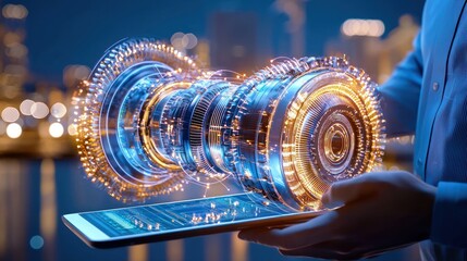 Electric motor focusing on the sleek design and intricate mechanical details There's a glowing neon blue spiral around one side of the engine. symbolizes innovation in automotive technology.