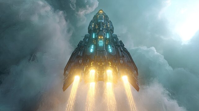 Sci-fi spaceship ascends through cloudy atmosphere, with bright light emanating from engines