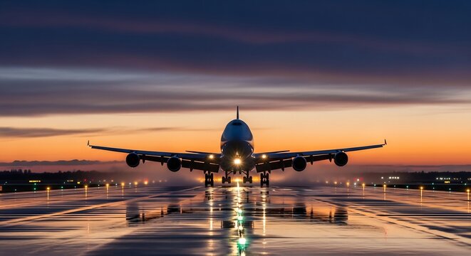 Airplane Taking Off at Sunset - A Majestic Aviation Scene with Glowing Lights.