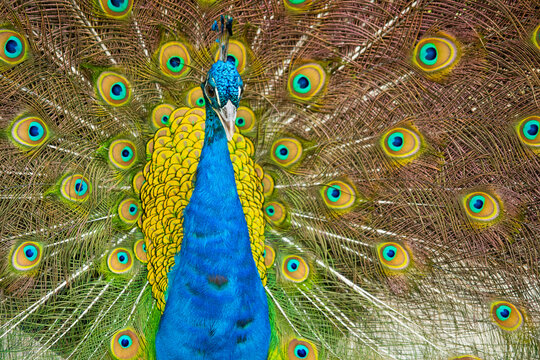 Peacock displaying iridescent blue and green tail fan with eye-patterned feathers and plume