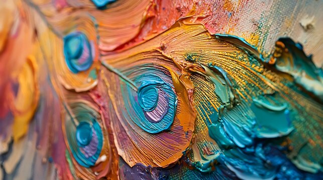 Vibrant stylized peacock animal with colorful feathers in brushstroke background