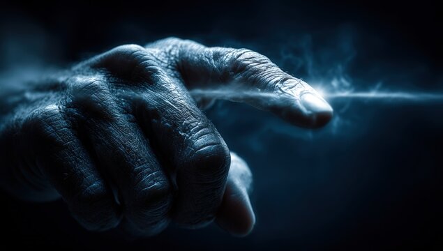 Magical glowing particles emitting from fingertip in dark blurred background, creating mystical and enchanting atmosphere
