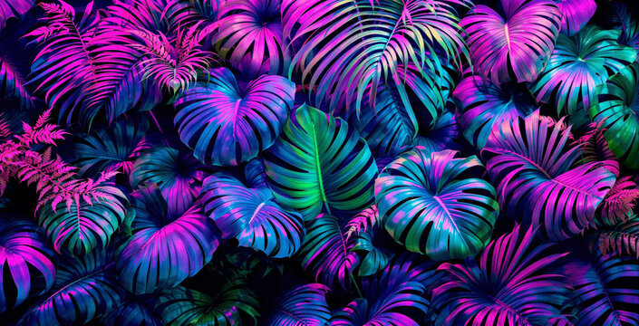 Colorful tropical leaves with neon pink, blue, and green tones on a dark background. Creative botanical wallpaper concept. Ai generative