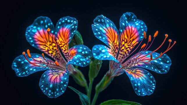 Glowing, vibrant flowers, close-up, dark background, botanical art