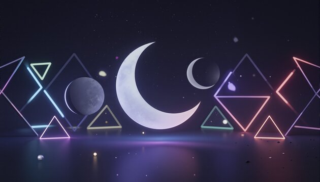 A modern digital art piece featuring stylized crescent moons in different sizes floating among glowing geometric shapes and colored lights.