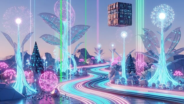 A surreal garden where plants grow from glowing data streams and geometric shapes, pastel futuristic landscape, symbolic of AI, data, and innovation, ultra-clean digital illustration