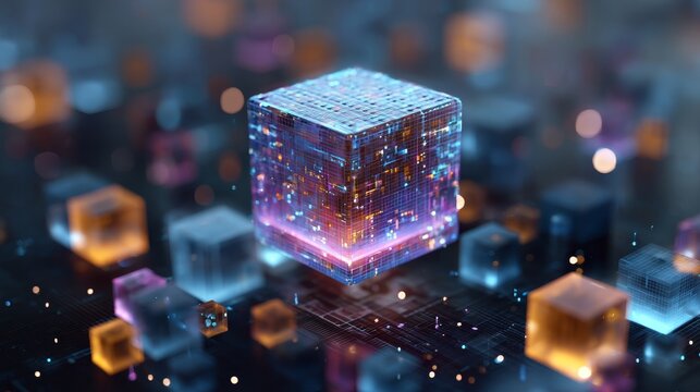 Illuminated data streams and suspended cubes create a futuristic digital landscape