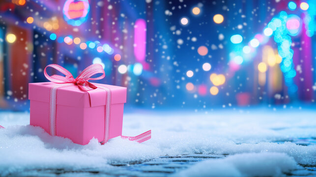 A christmas birthday anniversary gift, the box glowing from within with magical sparkles isolated on a dark pink background with copy space